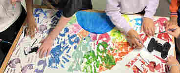 Les élèves avaient déjà mélangé leurs propres couleurs et apposé leurs empreintes de mains, formant un arc-en-ciel collectif.